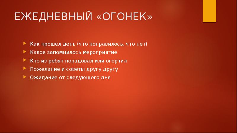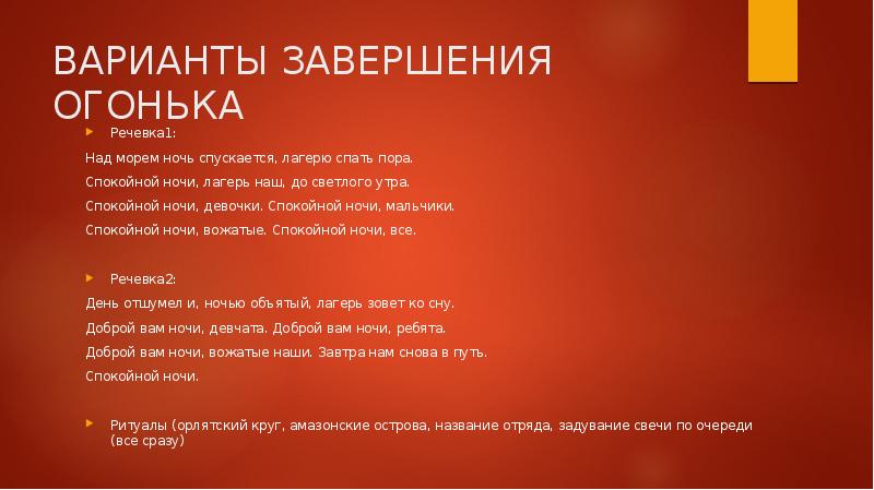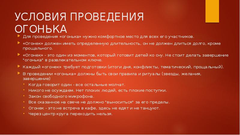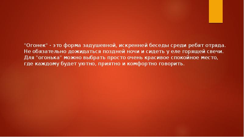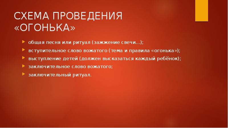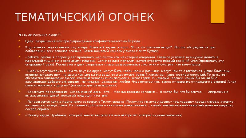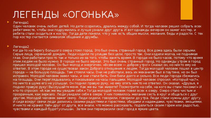 Один человек очень любил детей. Но дети ссорились, дрались между собой. И тогда человек решил собрать всех ребят вместе, чтобы они подружились и лучше узнали друг друга. И вот однажды вечером он зажег костер, и ребята стали сходиться к костру. Тогда дети поняли, что у них есть общие мысли, желания, беды и радости. С тех пор костер считается символом общения и дружбы.