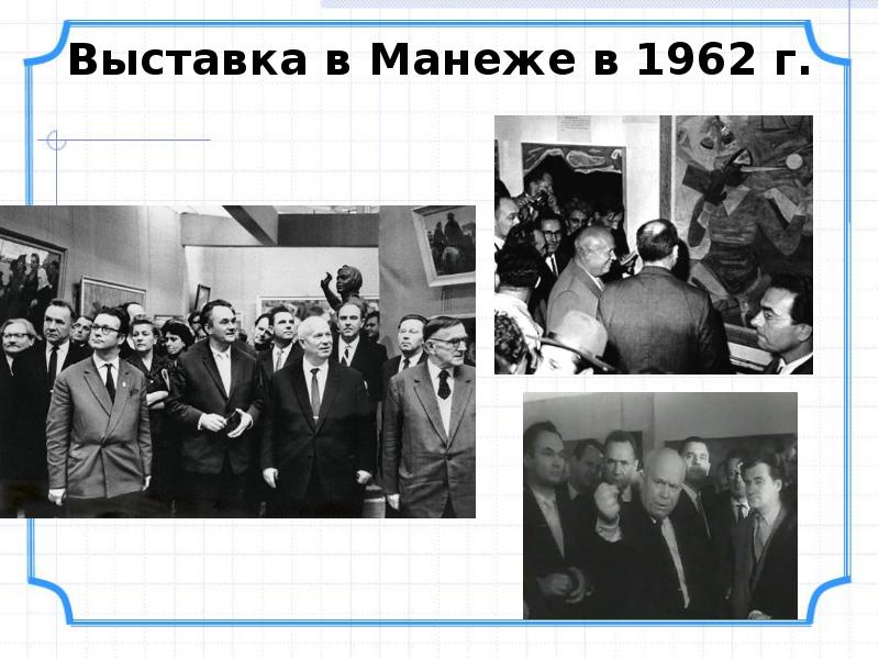 - 28. В 1962 г. Н.С. Хрущев посетил выставку московских художников-авангардистов в Манеже.