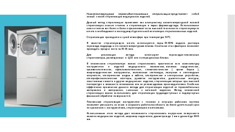 Общая продолжительность цикла стерилизации составляет 36 мин. Это самое короткое время цикла среди известных методов стерилизации, что позволяет сократить трудозатраты персонала, расход электроэнергии, значительно уменьшить количество однотипных инструментов, необходимых для обеспечения лечебного процесса, быстро подготовить требуемый набор медицинских изделий к следующей операции. Кроме того, значительно увеличивается число циклов стерилизации, которое можно осуществить за рабочую смену.