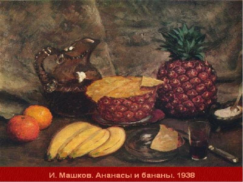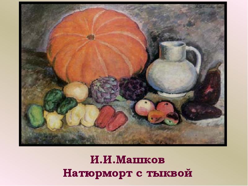 Беседа Какие предметы изображает Илья Иванович Машков на своих натюрмортах? Как выписаны эти предметы на полотнах – тщательно, грубо, примитивно? Какие краски предпочитает художник? Как вы думаете, почему на его натюрмортах так много красного и желтого цвета?