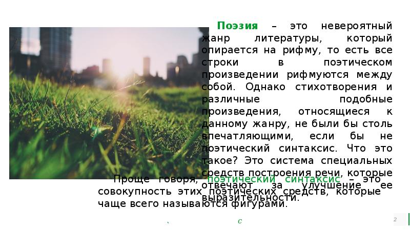 - 20. Инверсия Широко используется инверсия в стихотворных текстах, требующих ритмической организации речи: