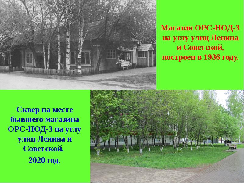 - 14. Магазин ОРС-НОД-3 на углу улиц Ленина и Советской, построен в 1936