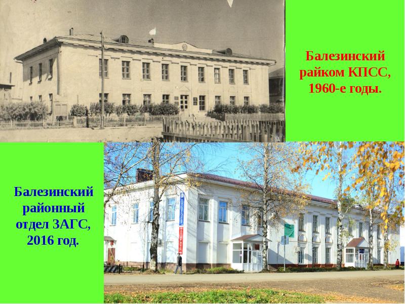- 21. Балезинский райком КПСС, 1960-е годы. Балезинский районный отдел ЗАГС, 2016 год.