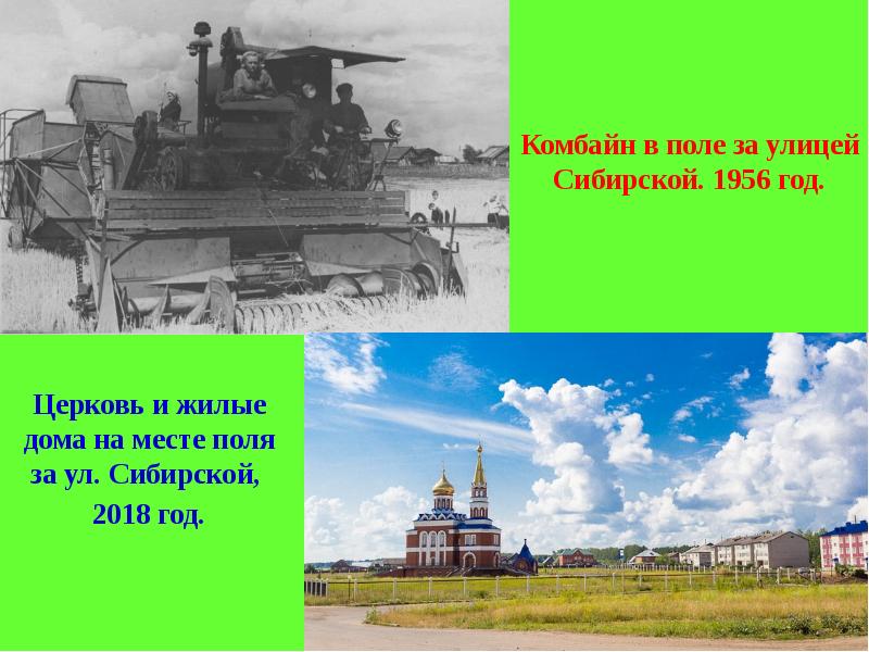 - 28. Комбайн в поле за улицей Сибирской. 1956 год. Церковь и