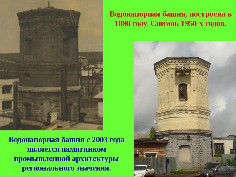 - 9. Водонапорная башня, построена в 1898 году. Снимок 1950-х годов. Водонапорная башня