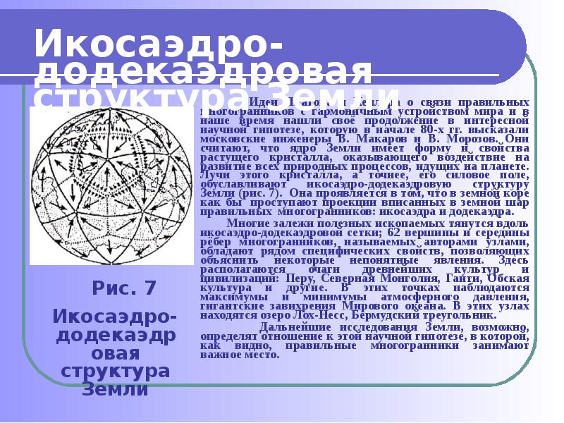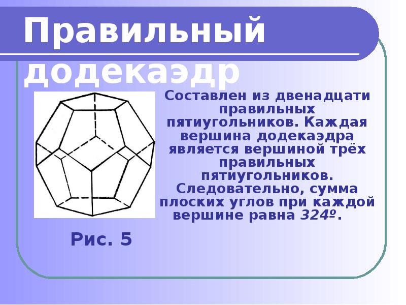 - 7. Составлен из двенадцати правильных пятиугольников. Каждая вершина додекаэдра является вершиной трёх