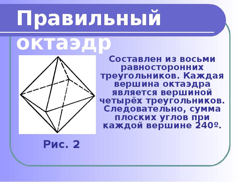 - 4. Составлен из восьми равносторонних треугольников. Каждая вершина октаэдра является вершиной четырёх
