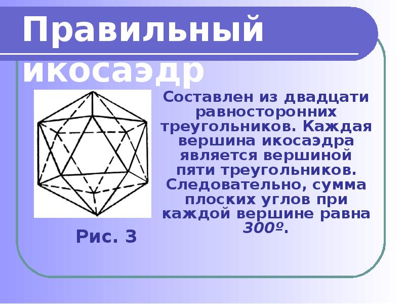 - 5. Составлен из двадцати равносторонних треугольников. Каждая вершина икосаэдра является вершиной пяти