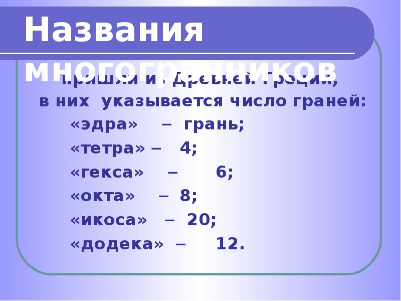 - 8. Названия многогранников пришли из Древней Греции, в них указывается