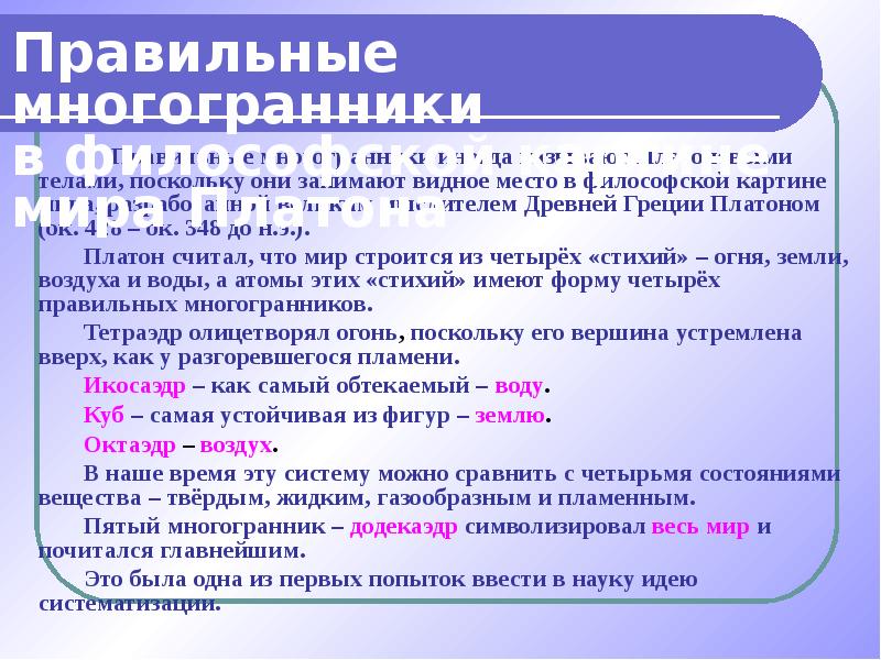 - 9. Правильные многогранники иногда называют Платоновыми телами, поскольку они занимают видное место