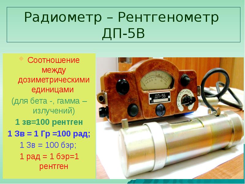 - 11. Радиометр-рентгенометр ДП-5В Предназначен: для измерения уровня радиации на местности для измерения