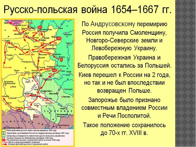- 15. условия Андрусовского перемирия России возвращались не только Смоленские, Северские земли,