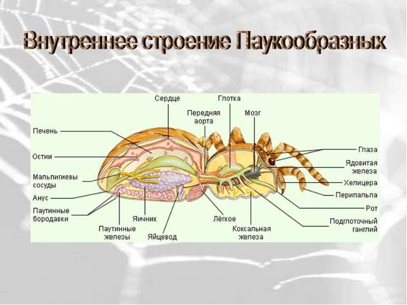 - 8. Характеристика Класс Паукообразные (ARACHNIDA) Морфофизиологическая характеристика. Тело разделено на головогрудь и