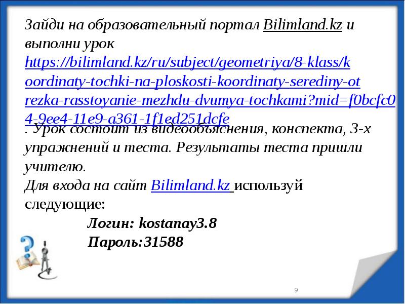 - 2. Цели обучения: 8.1.3.15 находить координаты середины отрезка; 8.1.3.16 находить координаты точки,