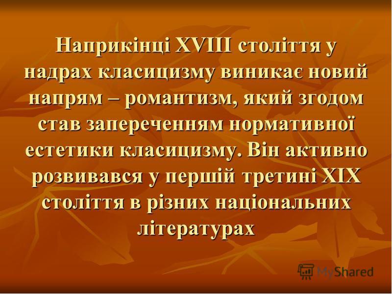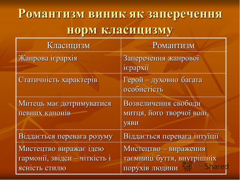 - 4. Романтизм виник як заперечення норм класицизму КласицизмРомантизм Жанрова ієрархія Заперечення жанрової