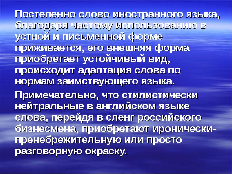 Постепенно слово иностранного языка, благодаря частому использованию в устной и письменной форме приживается, его внешняя форма приобретает устойчивый вид, происходит адаптация слова по нормам заимствующего языка. Постепенно слово иностранного языка, благодаря частому использованию в устной и письменной форме приживается, его внешняя форма приобретает устойчивый вид, происходит адаптация слова по нормам заимствующего языка. Примечательно, что стилистически нейтральные в английском языке слова, перейдя в сленг российского бизнесмена, приобретают иронически-пренебрежительную или просто разговорную окраску.