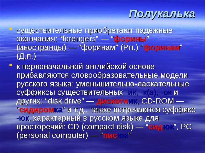 Полукалька существительные приобретают падежные окончания: “forengers” — “форины” (иностранцы) — “форинам” (Р.п.) “форинам” (Д.п.) к первоначальной английской основе прибавляются словообразовательные модели русского языка: уменьшительно-ласкательные суффиксы существительных -ик, -к(а), -ок и других: “disk drive” — дискетник, CD-ROM — “сидиромка” и т.д., также встречаются суффикс -юк, характерный в русском языке для просторечий: CD (compact disk) — “сидюк”, PC (personal computer) — “писюк”