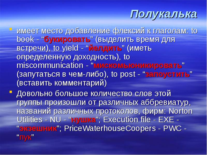 Полукалька имеет место добавление флексий к глаголам: to book - “букировать” (выделить время для встречи), to yield - “йелдить” (иметь определенную доходность), to miscommunication - “мискомьюникировать” (запутаться в чем-либо), to post - “запоустить” (вставить комментарий) Довольно большое количество слов этой группы произошли от различных аббревиатур, названий различных протоколов, фирм: Norton Utilities - NU - “нушка”; Execution file - EXE - “экзешник”; PriceWaterhouseCoopers - PWC - “пук”