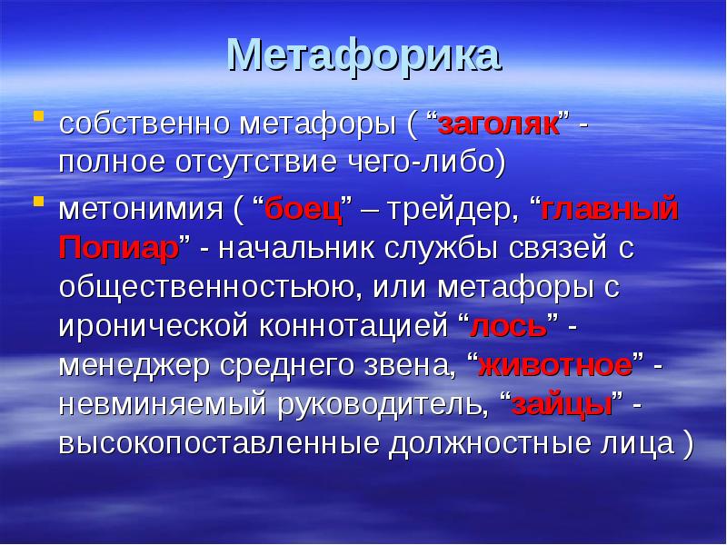 Метафорика собственно метафоры ( “заголяк” - полное отсутствие чего-либо) метонимия ( “боец” – трейдер, “главный Попиар” - начальник службы связей с общественностьюю, или метафоры с иронической коннотацией “лось” - менеджер среднего звена, “животное” - невминяемый руководитель, “зайцы” - высокопоставленные должностные лица )