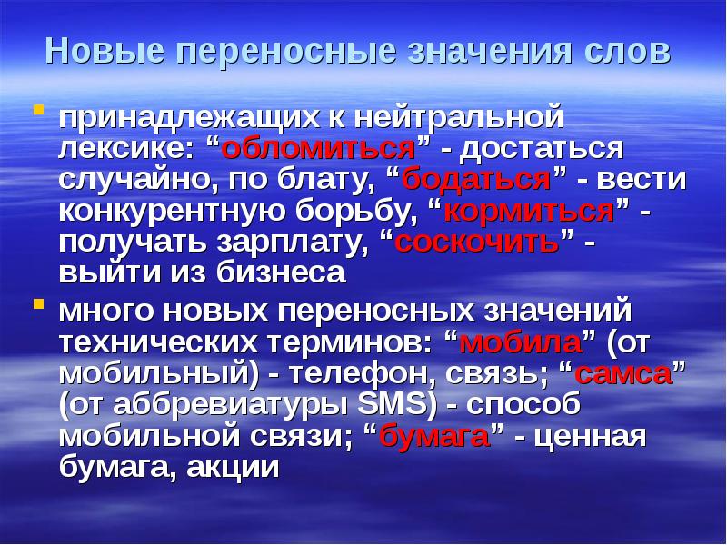 Новые переносные значения слов принадлежащих к нейтральной лексике: “обломиться” - достаться случайно, по блату, “бодаться” - вести конкурентную борьбу, “кормиться” - получать зарплату, “соскочить” - выйти из бизнеса много новых переносных значений технических терминов: “мобила” (от мобильный) - телефон, связь; “самса” (от аббревиатуры SMS) - способ мобильной связи; “бумага” - ценная бумага, акции