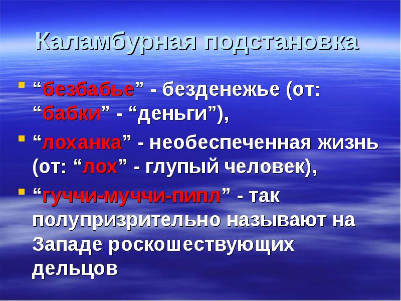 Каламбурная подстановка “безбабье” - безденежье (от: “бабки” - “деньги”), “лоханка” - необеспеченная жизнь (от: “лох” - глупый человек), “гуччи-муччи-пипл” - так полупризрительно называют на Западе роскошествующих дельцов