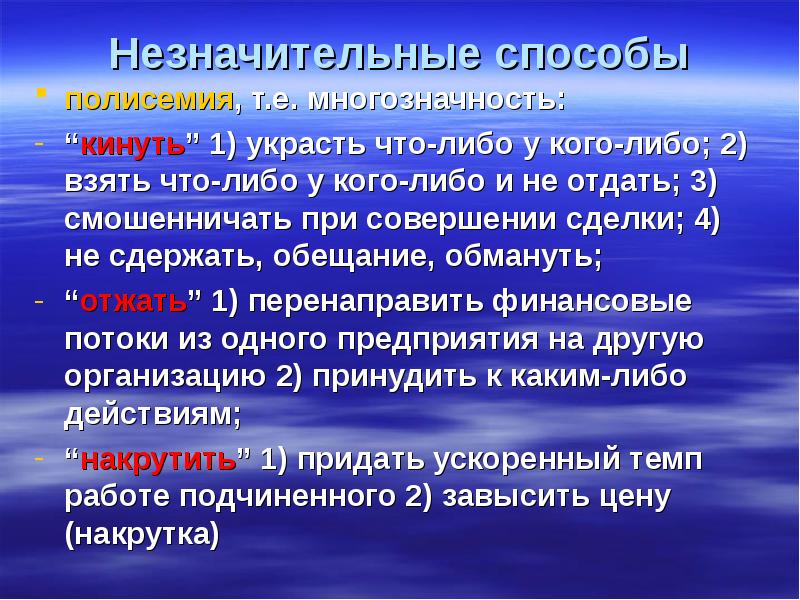 Незначительные способы полисемия, т.е. многозначность: “кинуть” 1) украсть что-либо у кого-либо; 2) взять что-либо у кого-либо и не отдать; 3) смошенничать при совершении сделки; 4) не сдержать, обещание, обмануть; “отжать” 1) перенаправить финансовые потоки из одного предприятия на другую организацию 2) принудить к каким-либо действиям; “накрутить” 1) придать ускоренный темп работе подчиненного 2) завысить цену (накрутка)
