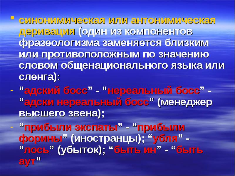 синонимическая или антонимическая деривация (один из компонентов фразеологизма заменяется близким или противоположным по значению словом общенационального языка или сленга): синонимическая или антонимическая деривация (один из компонентов фразеологизма заменяется близким или противоположным по значению словом общенационального языка или сленга): “адский босс” - “нереальный босс” - “адски нереальный босс” (менеджер высшего звена); “прибыли экспаты” - “прибыли форины” (иностранцы); “убля” - “лось” (убыток); “быть ин” - “быть аут”