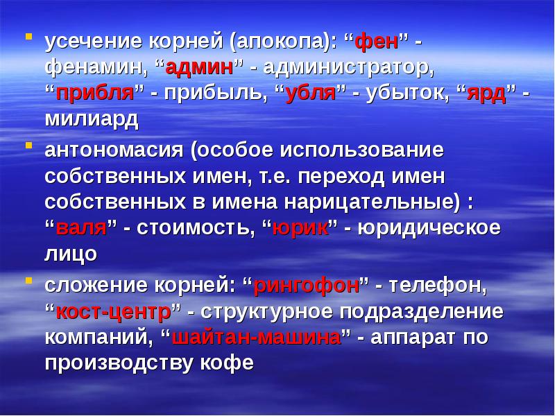 усечение корней (апокопа): “фен” - фенамин, “админ” - администратор, “прибля” - прибыль, “убля” - убыток, “ярд” - милиард усечение корней (апокопа): “фен” - фенамин, “админ” - администратор, “прибля” - прибыль, “убля” - убыток, “ярд” - милиард антономасия (особое использование собственных имен, т.е. переход имен собственных в имена нарицательные) : “валя” - стоимость, “юрик” - юридическое лицо сложение корней: “рингофон” - телефон, “кост-центр” - структурное подразделение компаний, “шайтан-машина” - аппарат по производству кофе