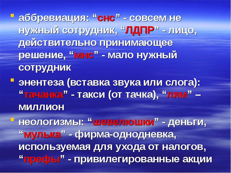 аббревиация: “снс” - совсем не нужный сотрудник, “ЛДПР” - лицо, действительно принимающее решение, “мнс” - мало нужный сотрудник аббревиация: “снс” - совсем не нужный сотрудник, “ЛДПР” - лицо, действительно принимающее решение, “мнс” - мало нужный сотрудник энентеза (вставка звука или слога): “тачанка” - такси (от тачка), “лям” – миллион неологизмы: “шевелюшки” - деньги, “мулька” - фирма-однодневка, используемая для ухода от налогов, “префы” - привилегированные акции