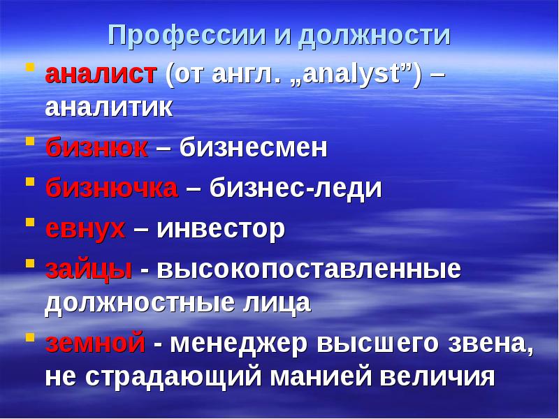 Профессии и должности аналист (от англ. „аnalyst”) – аналитик бизнюк – бизнесмен бизнючка – бизнес-леди евнух – инвестор зайцы - высокопоставленные должностные лица земной - менеджер высшего звена, не страдающий манией величия