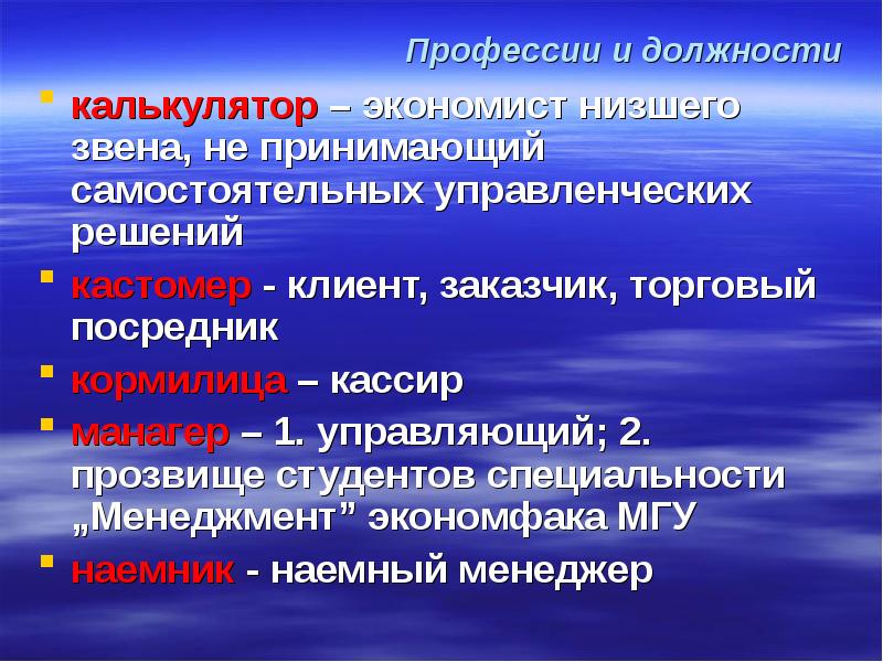 Профессии и должности калькулятор – экономист низшего звена, не принимающий самостоятельных управленческих решений кастомер - клиент, заказчик, торговый посредник кормилица – кассир манагер – 1. управляющий; 2. прозвище студентов специальности „Менеджмент” экономфака МГУ наемник - наемный менеджер