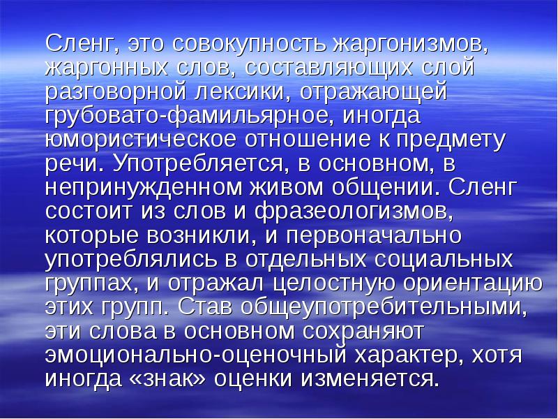 Сленг, это совокупность жаргонизмов, жаргонных слов, составляющих слой разговорной лексики, отражающей грубовато-фамильярное, иногда юмористическое отношение к предмету речи. Употребляется, в основном, в непринужденном живом общении. Сленг состоит из слов и фразеологизмов, которые возникли, и первоначально употреблялись в отдельных социальных группах, и отражал целостную ориентацию этих групп. Став общеупотребительными, эти слова в основном сохраняют эмоционально-оценочный характер, хотя иногда «знак» оценки изменяется. Сленг, это совокупность жаргонизмов, жаргонных слов, составляющих слой разговорной лексики, отражающей грубовато-фамильярное, иногда юмористическое отношение к предмету речи. Употребляется, в основном, в непринужденном живом общении. Сленг состоит из слов и фразеологизмов, которые возникли, и первоначально употреблялись в отдельных социальных группах, и отражал целостную ориентацию этих групп. Став общеупотребительными, эти слова в основном сохраняют эмоционально-оценочный характер, хотя иногда «знак» оценки изменяется.
