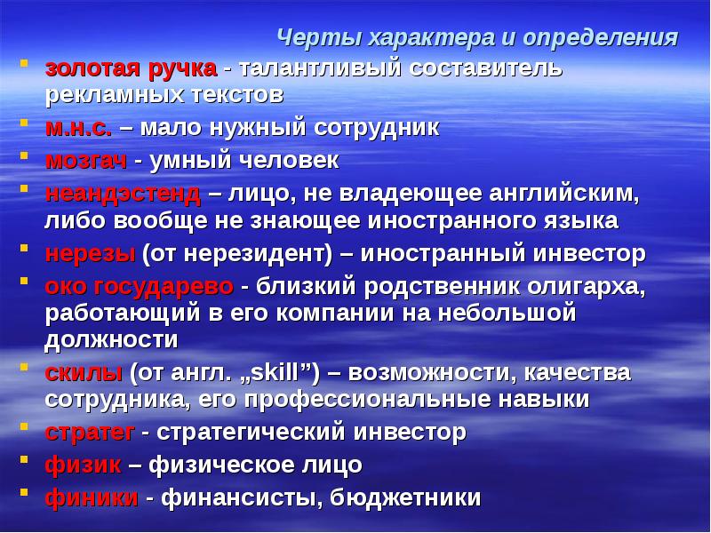 Черты характера и определения золотая ручка - талантливый составитель рекламных текстов м.н.с. – мало нужный сотрудник мозгач - умный человек неандэстенд – лицо, не владеющее английским, либо вообще не знающее иностранного языка нерезы (от нерезидент) – иностранный инвестор око государево - близкий родственник олигарха, работающий в его компании на небольшой должности скилы (от англ. „skill”) – возможности, качества сотрудника, его профессиональные навыки стратег - стратегический инвестор физик – физическое лицо финики - финансисты, бюджетники