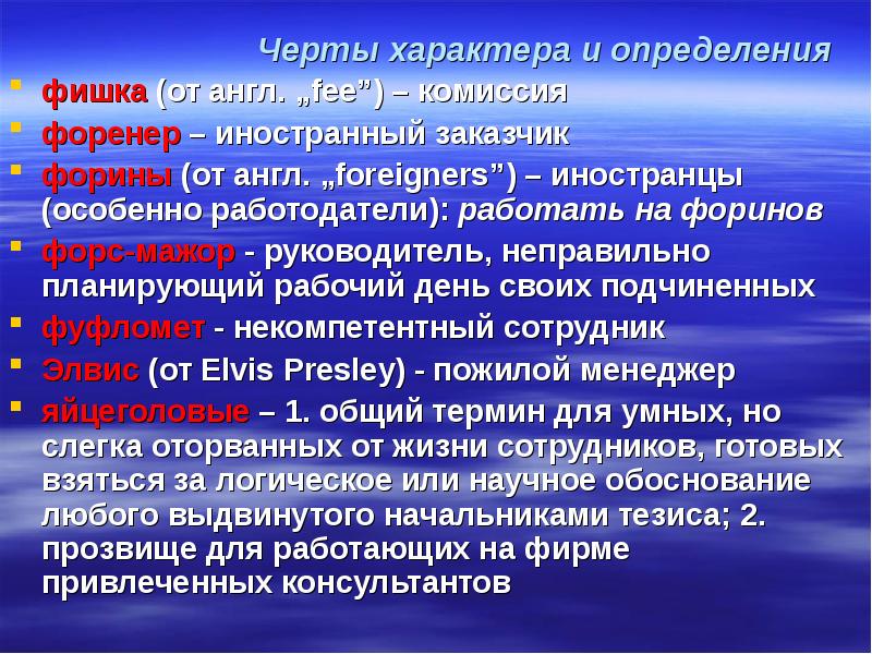 Черты характера и определения фишка (от англ. „fee”) – комиссия форенер – иностранный заказчик форины (от англ. „foreigners”) – иностранцы (особенно работодатели): работать на форинов форс-мажор - руководитель, неправильно планирующий рабочий день своих подчиненных фуфломет - некомпетентный сотрудник Элвис (от Elvis Presley) - пожилой менеджер яйцеголовые – 1. общий термин для умных, но слегка оторванных от жизни сотрудников, готовых взяться за логическое или научное обоснование любого выдвинутого начальниками тезиса; 2. прозвище для работающих на фирме привлеченных консультантов