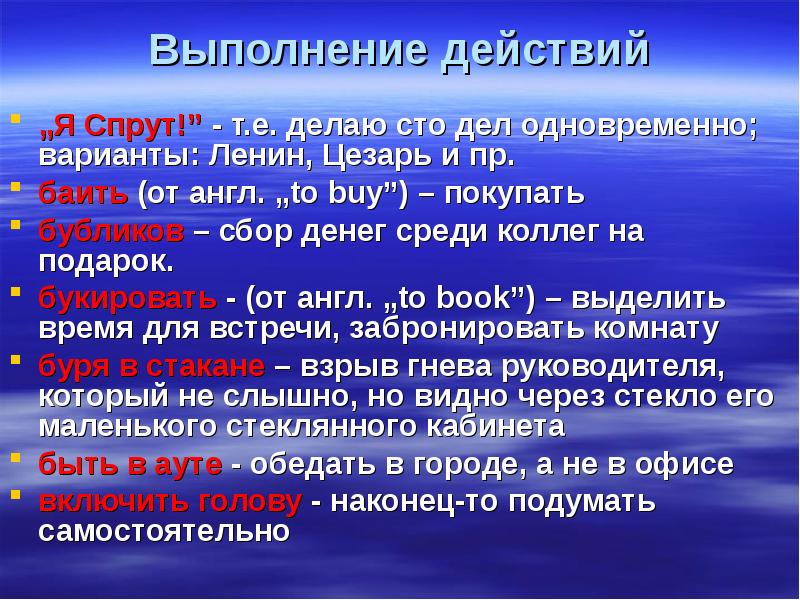 Выполнение действий „Я Спрут!” - т.е. делаю сто дел одновременно; варианты: Ленин, Цезарь и пр. баить (от англ. „to buy”) – покупать бубликов – сбор денег среди коллег на подарок. букировать - (от англ. „to book”) – выделить время для встречи, забронировать комнату буря в стакане – взрыв гнева руководителя, который не слышно, но видно через стекло его маленького стеклянного кабинета быть в ауте - обедать в городе, а не в офисе включить голову - наконец-то подумать самостоятельно