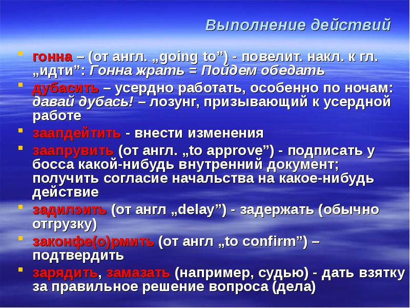 Выполнение действий гонна – (от англ. „going to”) - повелит. накл. к гл. „идти”: Гонна жрать = Пойдем обедать дубасить – усердно работать, особенно по ночам: давай дубась! – лозунг, призывающий к усердной работе заапдейтить - внести изменения заапрувить (от англ. „to approve”) - подписать у босса какой-нибудь внутренний документ; получить согласие начальства на какое-нибудь действие задилэить (от англ „delay”) - задержать (обычно отгрузку) законфе(о)рмить (от англ „to confirm”) – подтвердить зарядить, замазать (например, судью) - дать взятку за правильное решение вопроса (дела)