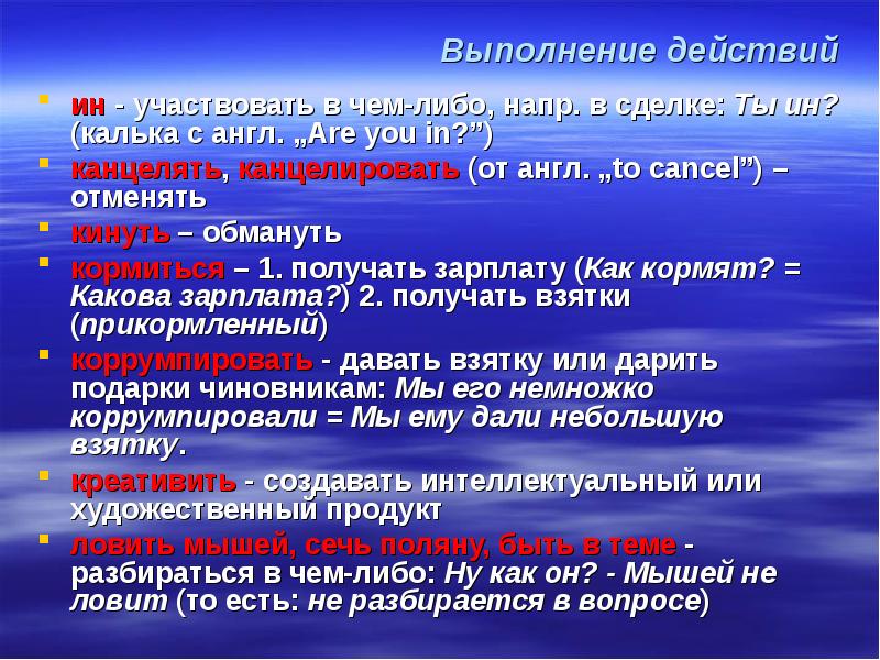 Выполнение действий ин - участвовать в чем-либо, напр. в сделке: Ты ин? (калька с англ. „Are you in?”) канцелять, канцелировать (от англ. „to cancel”) – отменять кинуть – обмануть кормиться – 1. получать зарплату (Как кормят? = Какова зарплата?) 2. получать взятки (прикормленный) коррумпировать - давать взятку или дарить подарки чиновникам: Мы его немножко коррумпировали = Мы ему дали небольшую взятку. креативить - создавать интеллектуальный или художественный продукт ловить мышей, сечь поляну, быть в теме - разбираться в чем-либо: Ну как он? - Мышей не ловит (то есть: не разбирается в вопросе)