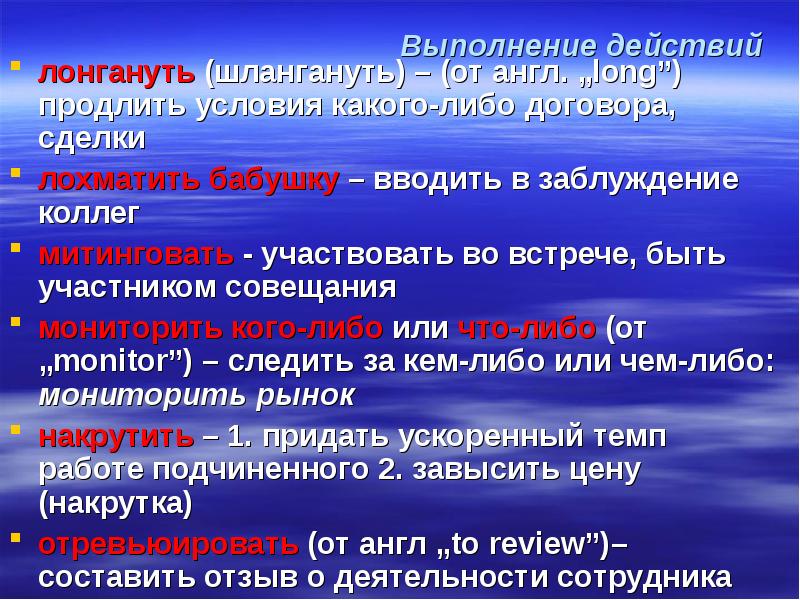Выполнение действий лонгануть (шлангануть) – (от англ. „long”) продлить условия какого-либо договора, сделки лохматить бабушку – вводить в заблуждение коллег митинговать - участвовать во встрече, быть участником совещания мониторить кого-либо или что-либо (от „monitor”) – следить за кем-либо или чем-либо: мониторить рынок накрутить – 1. придать ускоренный темп работе подчиненного 2. завысить цену (накрутка) отревьюировать (от англ „to review”)– составить отзыв о деятельности сотрудника