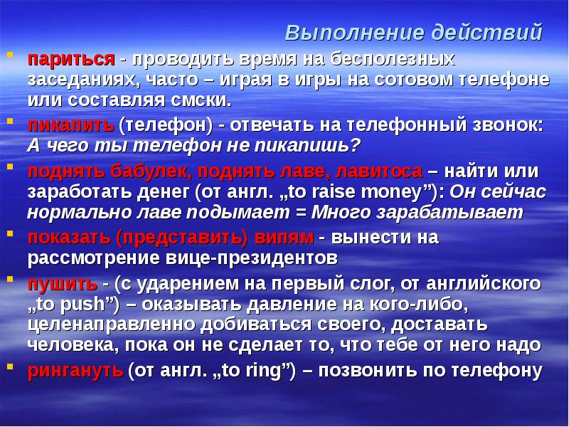 Выполнение действий париться - проводить время на бесполезных заседаниях, часто – играя в игры на сотовом телефоне или составляя смски. пикапить (телефон) - отвечать на телефонный звонок: А чего ты телефон не пикапишь? поднять бабулек, поднять лаве, лавитоса – найти или заработать денег (от англ. „to raise money”): Он сейчас нормально лаве подымает = Много зарабатывает показать (представить) випям - вынести на рассмотрение вице-президентов пушить - (с ударением на первый слог, от английского „to push”) – оказывать давление на кого-либо, целенаправленно добиваться своего, доставать человека, пока он не сделает то, что тебе от него надо рингануть (от англ. „to ring”) – позвонить по телефону