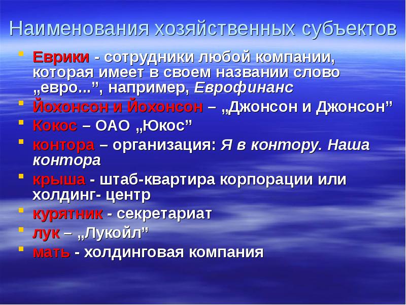 Наименования хозяйственных субъектов Еврики - сотрудники любой компании, которая имеет в своем названии слово „евро...”, например, Еврофинанс Йохонсон и Йохонсон – „Джонсон и Джонсон” Кокос – ОАО „Юкос” контора – организация: Я в контору. Наша контора крыша - штаб-квартира корпорации или холдинг- центр курятник - секретариат лук – „Лукойл” мать - холдинговая компания