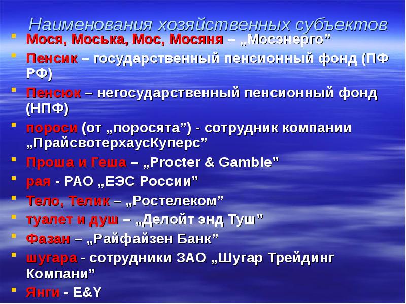 Наименования хозяйственных субъектов Мося, Моська, Мос, Мосяня – „Мосэнерго” Пенсик – государственный пенсионный фонд (ПФ РФ) Пенсюк – негосударственный пенсионный фонд (НПФ) пороси (от „поросята”) - сотрудник компании „ПрайсвотерхаусКуперс” Проша и Геша – „Procter & Gamble” рая - РАО „ЕЭС России” Тело, Телик – „Ростелеком” туалет и душ – „Делойт энд Туш” Фазан – „Райфайзен Банк” шугара - сотрудники ЗАО „Шугар Трейдинг Компани” Янги - E&Y