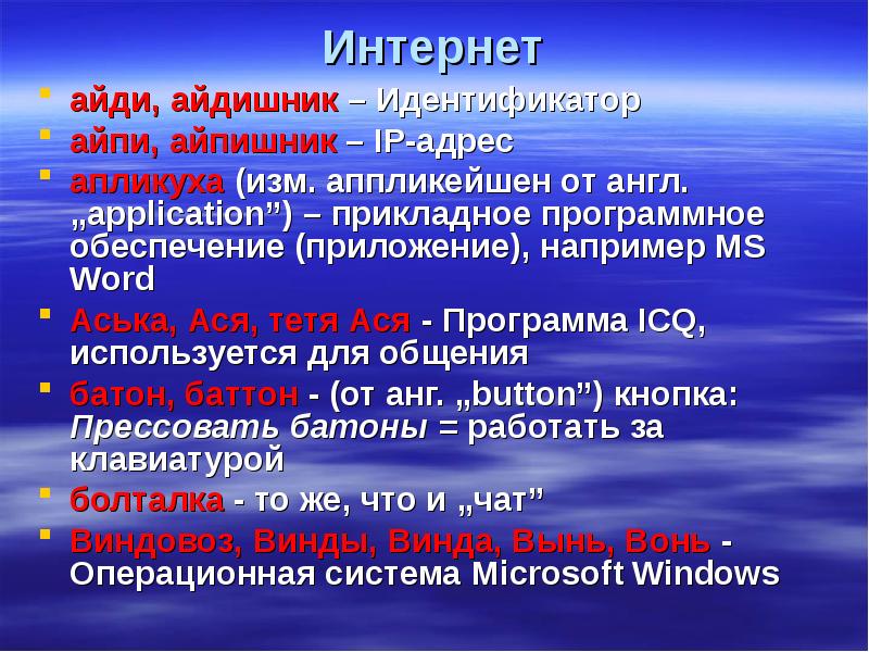 Интернет айди, айдишник – Идентификатор айпи, айпишник – IP-адрес апликуха (изм. аппликейшен от англ. „application”) – прикладное программное обеспечение (приложение), например MS Word Аська, Ася, тетя Ася - Программа ICQ, используется для общения батон, баттон - (от анг. „button”) кнопка: Прессовать батоны = работать за клавиатурой болталка - то же, что и „чат” Виндовоз, Винды, Винда, Вынь, Вонь - Операционная система Microsoft Windows