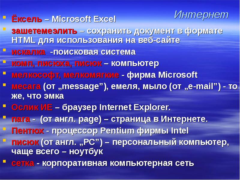 Интернет Ёксель – Microsoft Excel зашетемеэлить – сохранить документ в формате HTML для использования на веб-сайте искалка -поисковая система комп, писюха, писюк – компьютер мелкософт, мелкомягкие - фирма Microsoft месага (от „message”), емеля, мыло (от „e-mail”) - то же, что эмка Ослик ИЕ – браузер Internet Explorer. пага - (от англ. page) – страница в Интернете. Пентюх - процессор Pentium фирмы Intel писюк (от англ. „РС”) – персональный компьютер, чаще всего – ноутбук сетка - корпоративная компьютерная сеть
