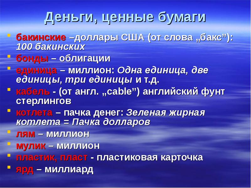 Деньги, ценные бумаги бакинские –доллары США (от слова „бакс”): 100 бакинских бонды – облигации единица – миллион: Oдна единица, две единицы, три единицы и т.д. кабель - (от англ. „cable”) английский фунт стерлингов котлета – пачка денег: Зеленая жирная котлета = Пачка долларов лям – миллион мулик – миллион пластик, пласт - пластиковая карточка ярд – миллиард