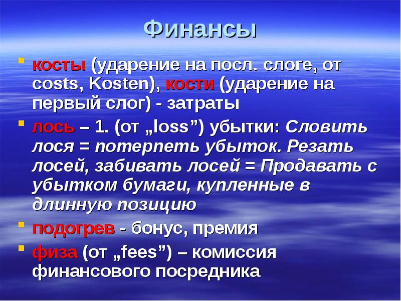 Финансы косты (ударение на посл. слоге, от costs, Kosten), кости (ударение на первый слог) - затраты лось – 1. (от „loss”) убытки: Словить лося = потерпеть убыток. Резать лосей, забивать лосей = Продавать с убытком бумаги, купленные в длинную позицию подогрев - бонус, премия физа (от „fees”) – комиссия финансового посредника