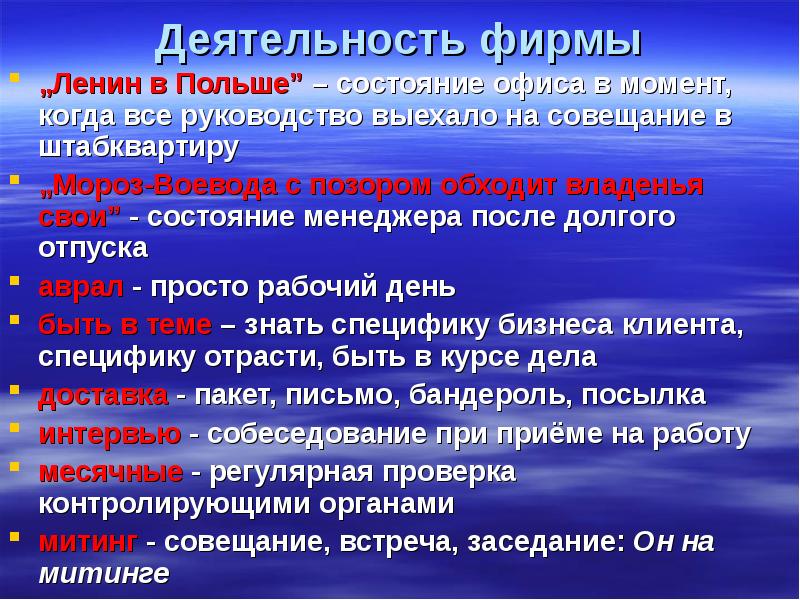 Деятельность фирмы „Ленин в Польше” – состояние офиса в момент, когда все руководство выехало на совещание в штабквартиру „Мороз-Воевода с позором обходит владенья свои” - состояние менеджера после долгого отпуска аврал - просто рабочий день быть в теме – знать специфику бизнеса клиента, специфику отрасти, быть в курсе дела доставка - пакет, письмо, бандероль, посылка интервью - собеседование при приёме на работу месячные - регулярная проверка контролирующими органами митинг - совещание, встреча, заседание: Он на митинге