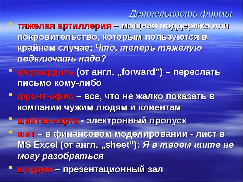 Деятельность фирмы тяжелая артиллерия – мощная поддержка или покровительство, которым пользуются в крайнем случае: Что, теперь тяжелую подключать надо? форвардить (от англ. „forward”) – переслать письмо кому-либо фронт-офис – все, что не жалко показать в компании чужим людям и клиентам шайтан-карта - электронный пропуск шит – в финансовом моделировании - лист в MS Excel (от англ. „sheet”): Я в твоем шите не могу разобраться шоурум – презентационный зал