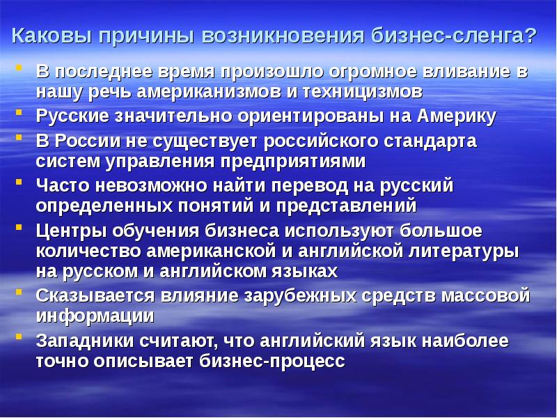 Каковы причины возникновения бизнес-сленга? В последнее время произошло огромное вливание в нашу речь американизмов и техницизмов Русские значительно ориентированы на Америку В России не существует российского стандарта систем управления предприятиями Часто невозможно найти перевод на русский определенных понятий и представлений Центры обучения бизнеса используют большое количество американской и английской литературы на русском и английском языках Сказывается влияние зарубежных средств массовой информации Западники считают, что английский язык наиболее точно описывает бизнес-процесс