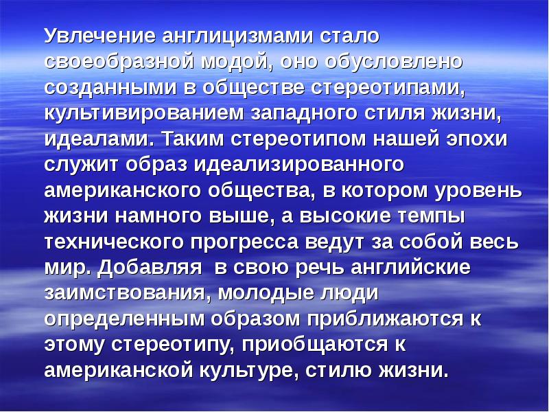 Увлечение англицизмами стало своеобразной модой, оно обусловлено созданными в обществе стереотипами, культивированием западного стиля жизни, идеалами. Таким стереотипом нашей эпохи служит образ идеализированного американского общества, в котором уровень жизни намного выше, а высокие темпы технического прогресса ведут за собой весь мир. Добавляя в свою речь английские заимствования, молодые люди определенным образом приближаются к этому стереотипу, приобщаются к американской культуре, стилю жизни. Увлечение англицизмами стало своеобразной модой, оно обусловлено созданными в обществе стереотипами, культивированием западного стиля жизни, идеалами. Таким стереотипом нашей эпохи служит образ идеализированного американского общества, в котором уровень жизни намного выше, а высокие темпы технического прогресса ведут за собой весь мир. Добавляя в свою речь английские заимствования, молодые люди определенным образом приближаются к этому стереотипу, приобщаются к американской культуре, стилю жизни.