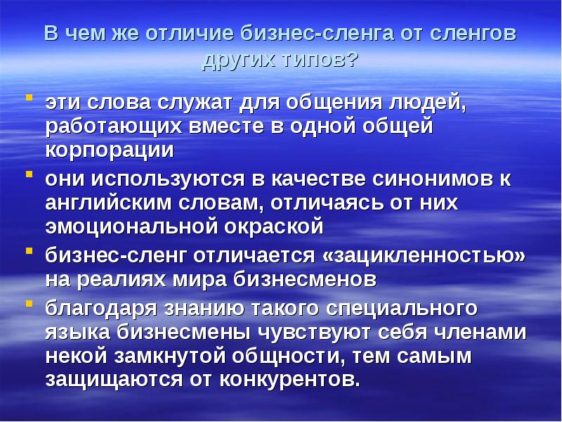В чем же отличие бизнес-сленга от сленгов других типов? эти слова служат для общения людей, работающих вместе в одной общей корпорации они используются в качестве синонимов к английским словам, отличаясь от них эмоциональной окраской бизнес-сленг отличается «зацикленностью» на реалиях мира бизнесменов благодаря знанию такого специального языка бизнесмены чувствуют себя членами некой замкнутой общности, тем самым защищаются от конкурентов.